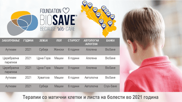 Две деца се од Црна Гора со дијагноза церебрална парализа, додека уште три деца се со аутизам, едното од Хрватска, двете од Србија, сите се на возраст од 6 до 9 години. Матични клетки од попочната врвца беа користени за време на овие терапии а биле зачувани или при раѓањето на сега заболените дечиња или за нивните браќа и сестри преку Bio Save. Сите спроведени терапии биле многу задоволителни и со мали или без несакани ефекти.