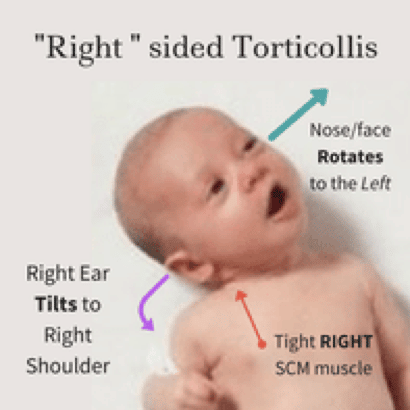 - Вежби за визуелно следење на непреферираната страна (користејќи слики со висок контраст за мали бебиња, светкави играчки или гласни играчки) за да помогнат во зајакнувањето на мускулите на спротивната страна на вратот